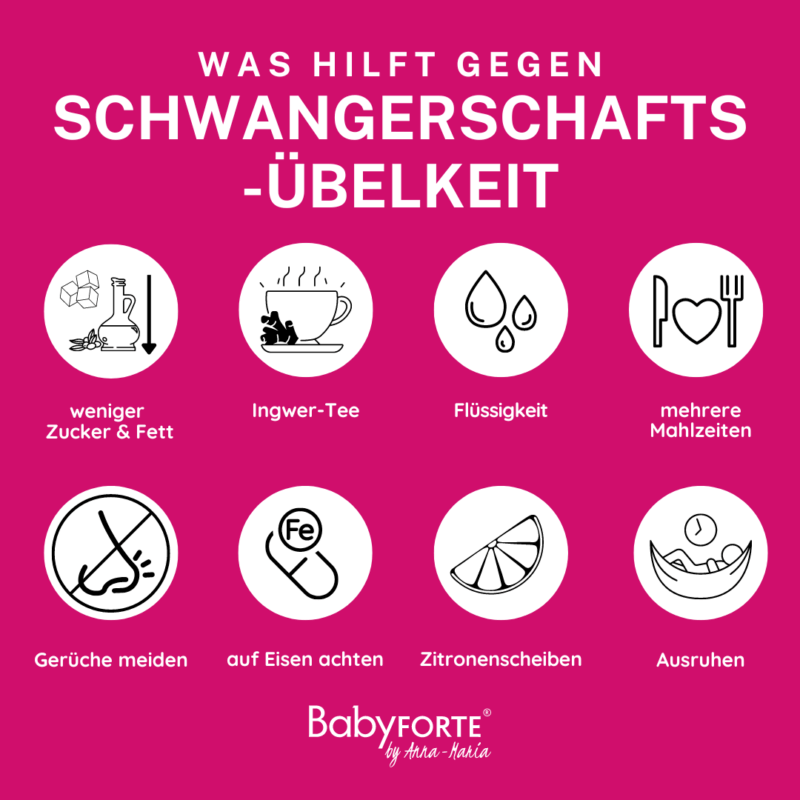 Außerdem kannst Du die Übelkeit während der Schwangerschaft ärztlich abklären lassen, wenn sie auch deutlich nach der 12. SSW auftritt.
